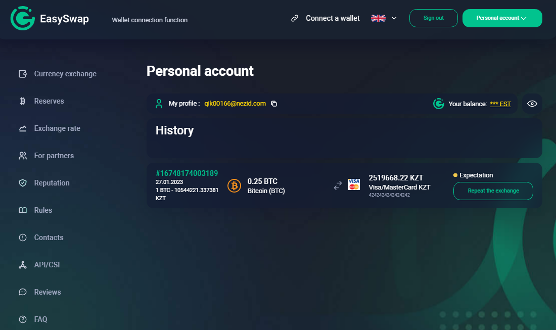 EasySwap değişim hizmeti, günün her saati elektronik para birimlerinin dönüştürülmesine yönelik başvuruları kabul eder. Bir başvurunun işlenmesi için geçen ortalama süre 3 ila 7 dakikadır.