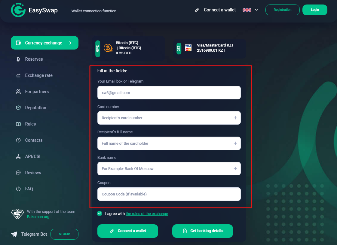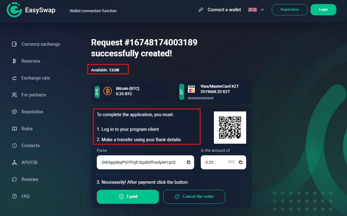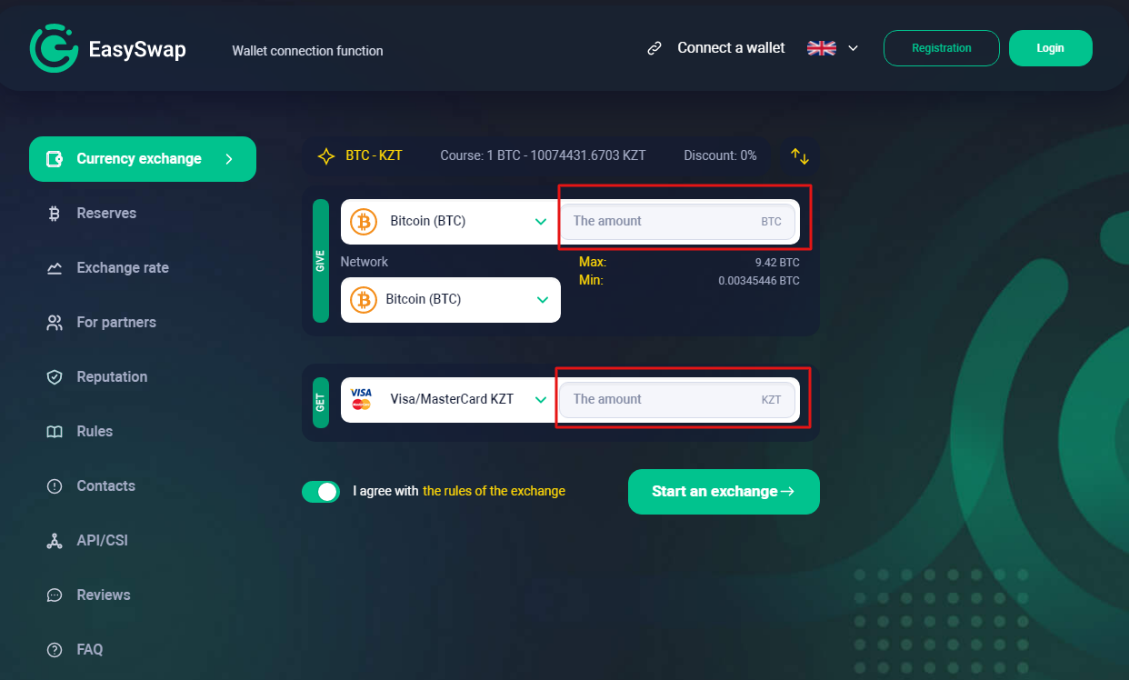 Değişim talebi oluşturma sürecini şu yön üzerinden inceleyelim: Bitcoin (BTC) – Visa/MasterCard KZT.